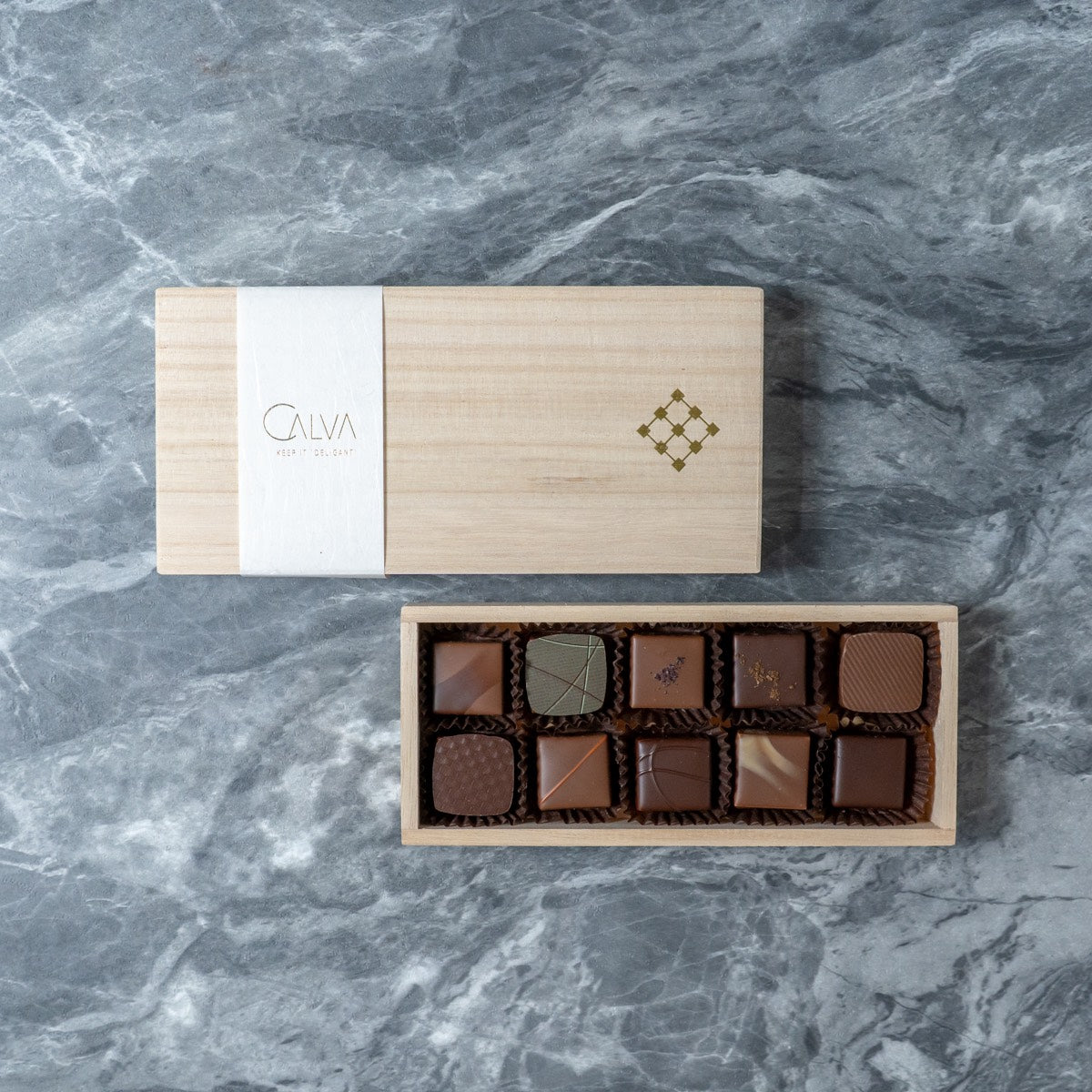 CALVAが誇る、個性豊かなボンボンショコラ10個を詰め合わせました。 ワールドチョコレートマスターズ2022で味覚部門で世界一の評価を得たシェフ田中二朗が、選び抜いたカカオと素材の個性を引き出し、一つ一つ丁寧に作り上げた至福のコレクションです。